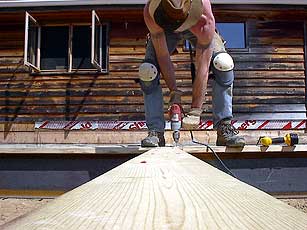 I attached the sill plates to the I-beams with self-tapping screws and steel-piercing nails fired from a special gun. Neighbours swore I'd started my own militia, the noise was so furious. One, Tim, even dropped by to see what the Hell was going on up here. "Oh nothing" I said, and then: "Wanna check out this gun that fires nails?" "Whoa yeah!" he said, eyes agog, as he cradled it in his hands. I wondered if I had made a mistake. |