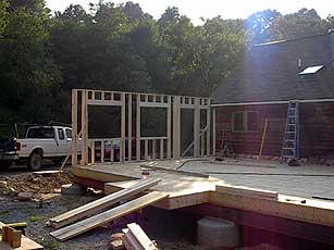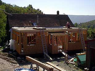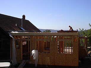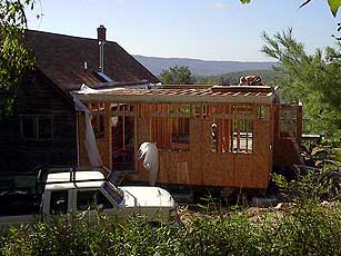 The first wall is always the most romantic. After that, taking photographs is a bit of a bore. This wall measures twenty-four feet and weighed in at an ungodly amount. I called down to Tim for help; he and his old man showed up more than ready to aid me. With little more than a couple of herniated discs we raised the wall and I nailed it off with a vengeance. The rest of the walls I raised myself. The old man's hair, by the way, was perfect. |