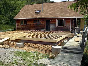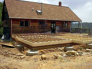I chose to use I-joists, a manufactured wood product with amazing span capacities, for the floor. Not exactly a time-saver, but for one guy working alone a manageable chunk of wood even at twenty-four feet in length. For the Entry I cantilevered solid joists out over the steel, and for the kitchen bay I did the same. I put down 3/4" tongue-and-groove ply for the subfloor and "glued 'n screwed" it as we say, only I didn't use screws, but nails. Lots of nails. California-seismic-code nailing schedule, to be exact. Force of habit. |